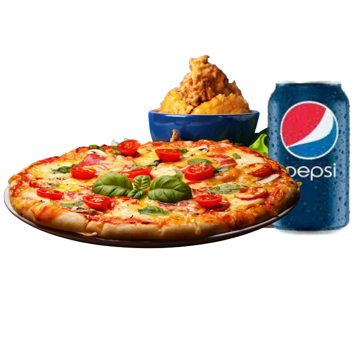 1 Medium 12- inch Pizza, 1 Regular side OR 1 Regular Popcorn Chicken & 1 Can of Pop.