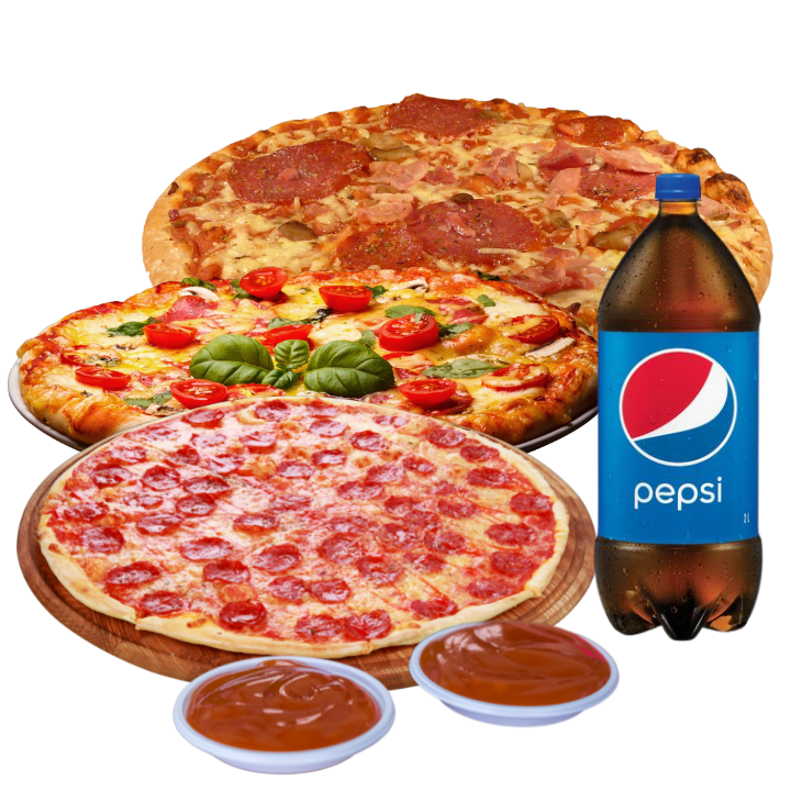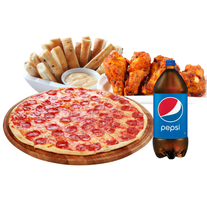 1 Large 14-inch Pizza, 10 Chicken Wings, 1 Garlic Cheesy Bread, & 2 L Pop.
